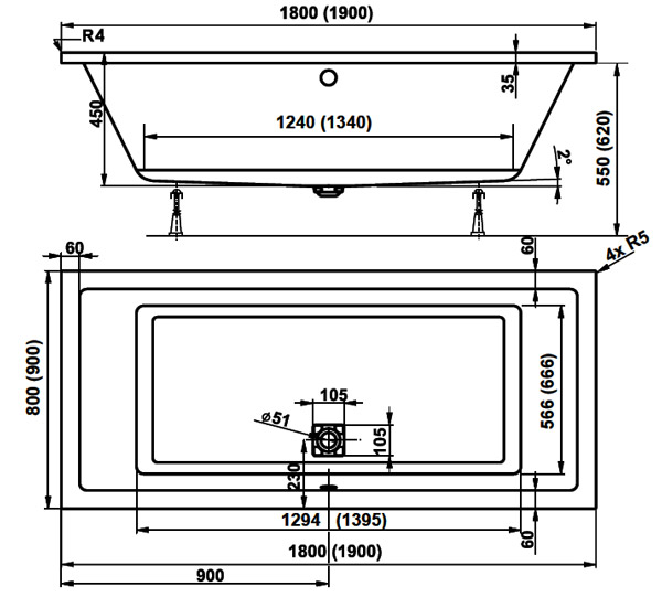 Baignoire rectangulaire, 190x90 cm, acrylique, Cavallo.