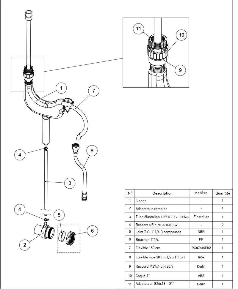 Cet ensemble comprend un tuyau en laiton de 150 cm, un tuyau blindé 1/2' x 1/4' de 25 cm, un tuyau PVC bleu de 100 cm, un récipient collecteur en plastique et les raccords nécessaires.
