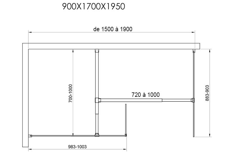 Fournie avec une barre de rigidité extensible. Modèle réversible gauche ou droite. Profilés en aluminium finition "chromée". Extensibilité de 0 à 20mm. Longueur réglable de 150 à 190 cm. Largeur : 90 cm. Hauteur : 195 cm. La paroi frontale mesure 100 cm de large.