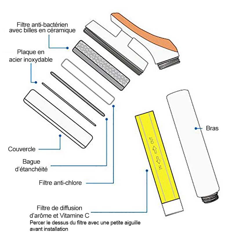 Ce pommeau de douche innovant, en plus de diffuser un parfum léger, possède un filtre antibactérien équipé de billes en céramique, et d'un filtre anti-chlore.