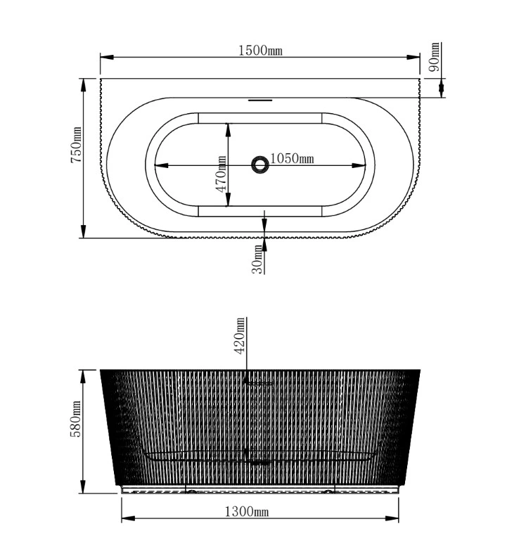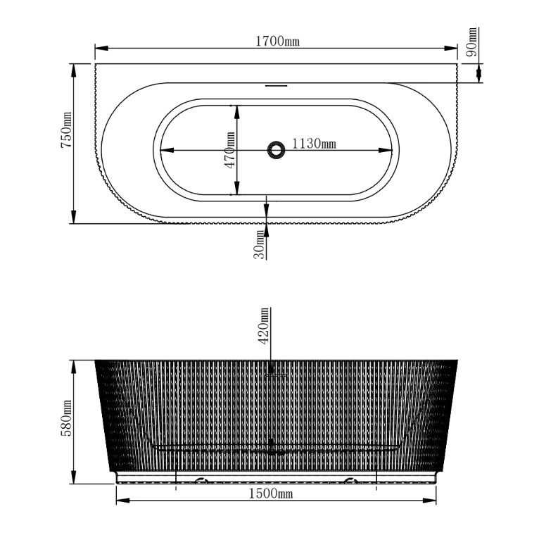 Baignoire murale cannelée ETRETAT en acrylique mat – 150 ou 170 cm avec plage de robinetterie
