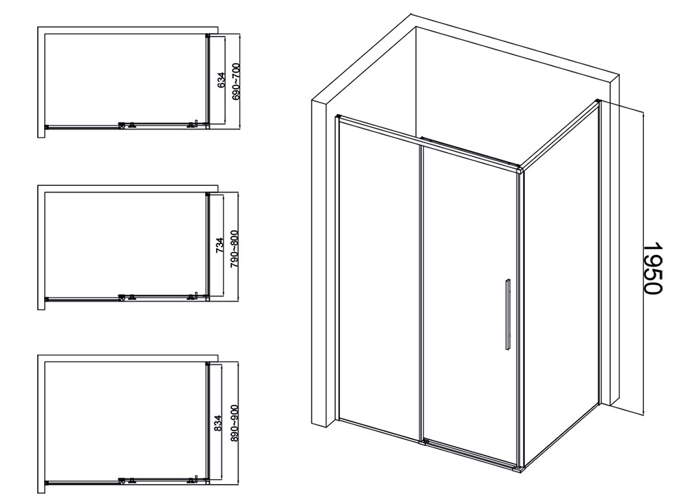 Dimensions : retour fixe 70 cm, porte de douche 100, 120 ou 140 cm.