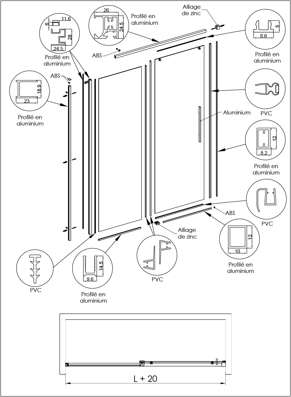 Poignée et profilés en aluminium. Modèle réversible gauche ou droite. Extensibilté de 0 à 10 mm. Hauteur : 195 cm.