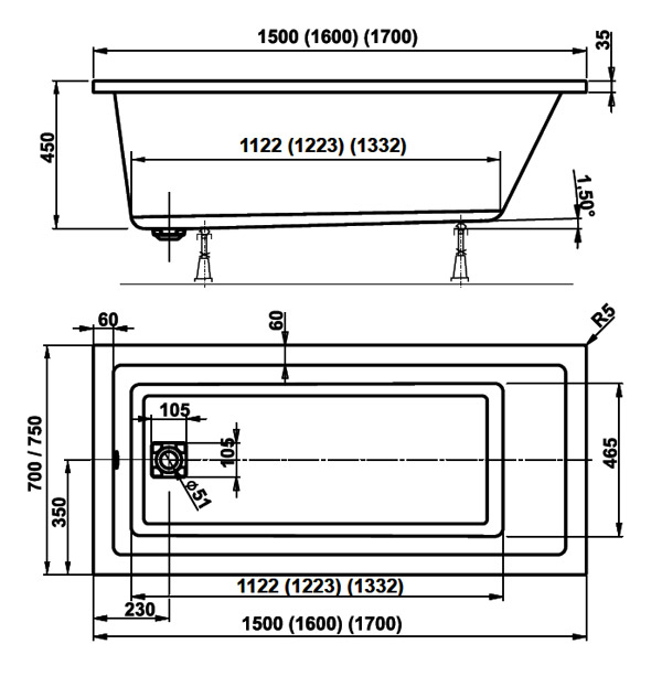 Avec trop plein. Pieds de réglage inclus. Vidage inclus. Robinetterie à commander séparément.