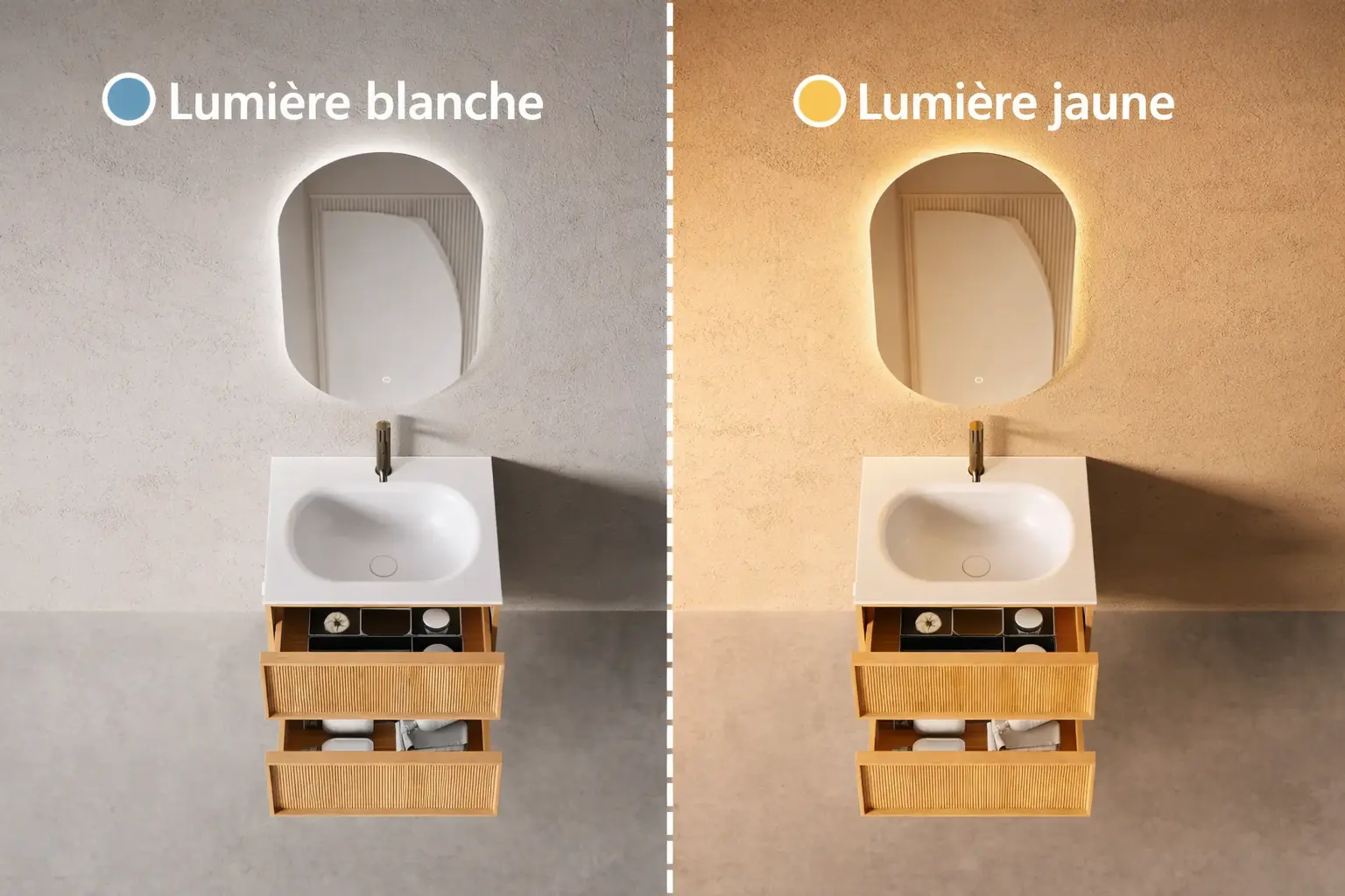 Le Solid Surface réagit à la lumière ambiante : sa teinte peut légèrement varier selon l’éclairage, plus chaude sous une lumière jaune et plus blanche sous un éclairage froid.