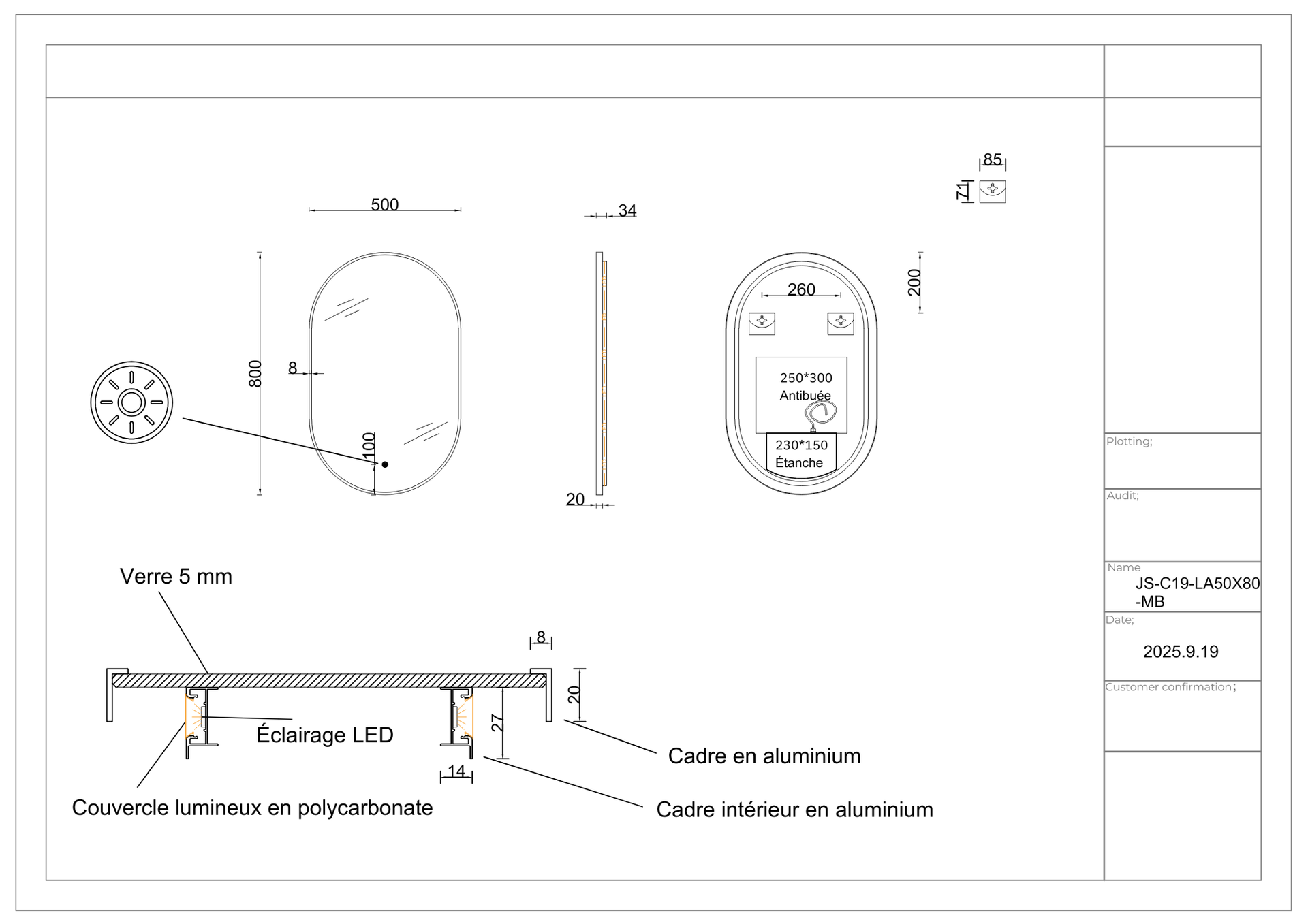 Miroir 50x80 avec éclairage led, anti-buée, bord fin noir mat