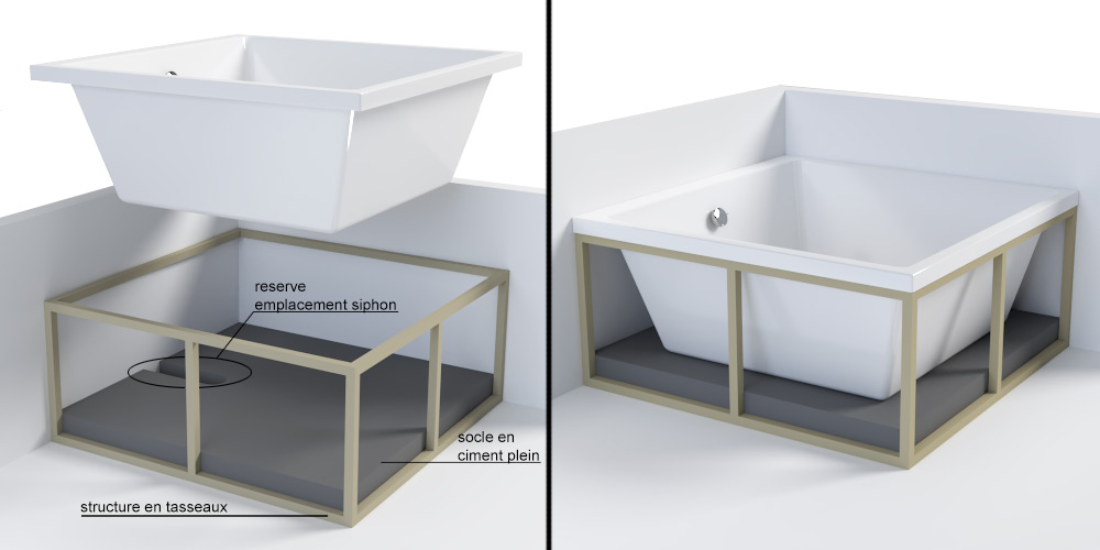 Cette baignoire pourra être installée en angle avec un tablier ou encastrée dans le sol.