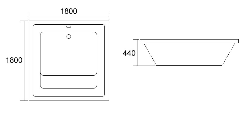 Baignoire carrée + robinetterie, 180x180 cm, acrylique, Quadra.