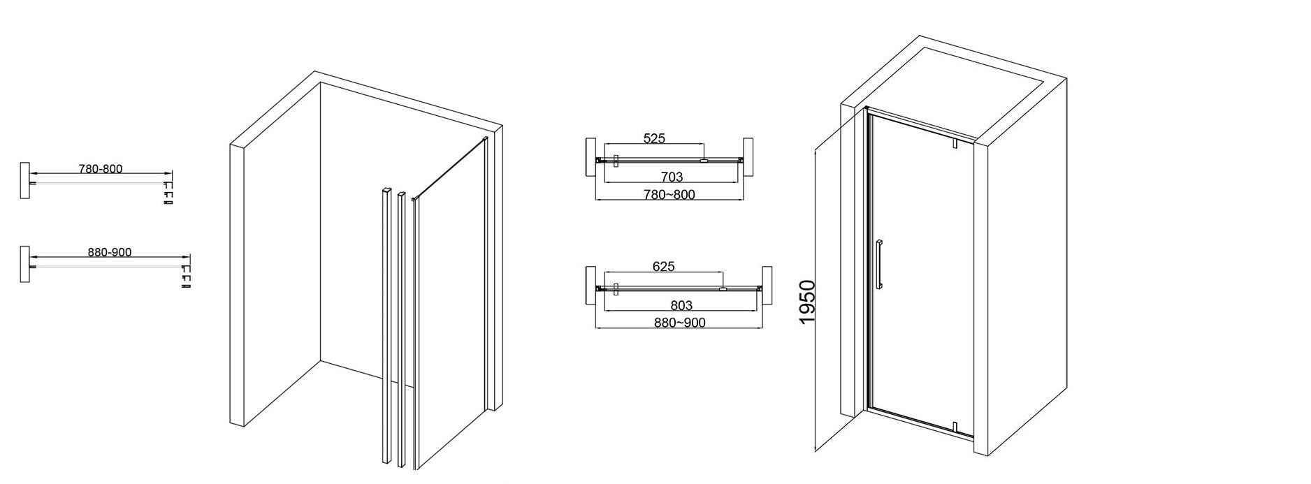 Le format 80 x 80 cm est composé d'une paroi fixe 80 cm et d'une porte pivotante 80cm.