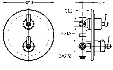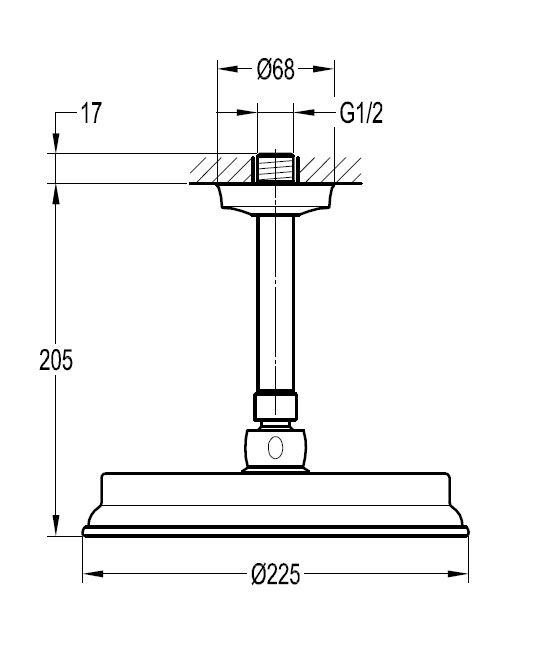Composition douche Liberty en laiton et finition traitée cuivre, pour installation à encastrer. Thermostatique à encastrer, 2 entrées, 2 sorties. Corps d'encastrement inclus. Douche de tête plafond diamètre 225mm. Douchette avec support, prise d'eau et flexible 150 cm.