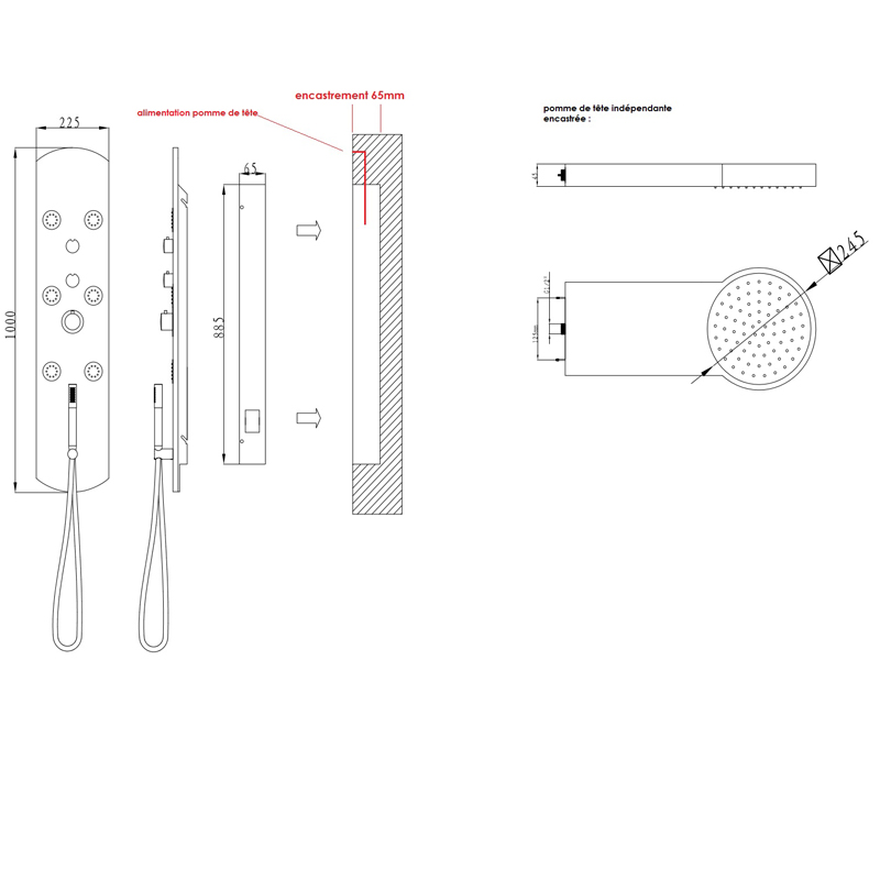 Le panneau de douche encastré Silk thermostatique, réalisé en acier inoxydable poli, allie qualité et bien-être. Ses jets massants associés à sa douche de tête indépendante vous offriront de véritable moments de détente. Silk est éclairée par des Leds sur tout son pourtour, ne nécéssitant ni pile ni alimentation électrique: Fonctionne par dynamo. Ne nécessite que 6.5cm d'encastrement. Douchette à main et flexible.