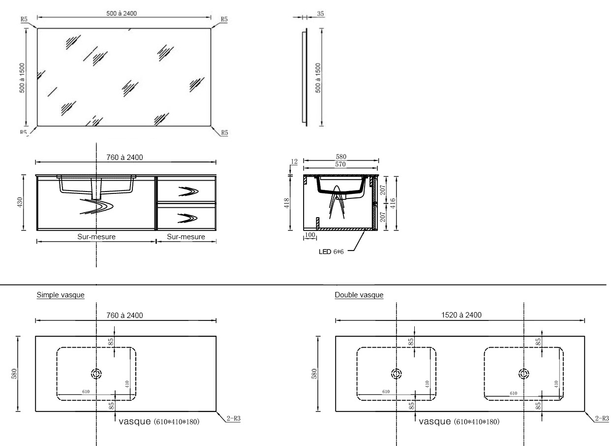 Le miroir LED en option, proposé de 500 à 1200 mm de largeur et de 500 à 1500 mm de hauteur.