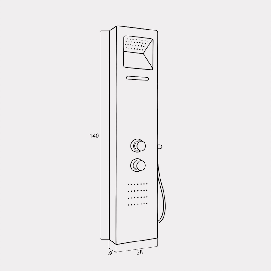 Ce panneau de douche mural est usiné en résine minérale Solid Surface, un matériau massif offrant une finition blanc mat résistante aux rayures et un toucher satiné. La structure intègre de manière encastrée une douche de tête à double fonction pluie et cascade, couplée à deux zones de jets massants frontaux. Mesurant 140 cm de hauteur pour une largeur de 28 cm, cette colonne de douche thermostatique se fixe en applique murale avec une profondeur de saillie de 9 cm. Le système de mitigeur thermostatique contrôle l'arrivée d'eau, tandis que la surface non poreuse de la résine minérale garantit un entretien direct et limite l'accumulation de calcaire.