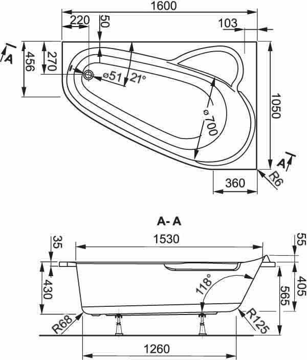 Baignoire d'angle asymétrique droite, 160 x 105 cm, Selena.