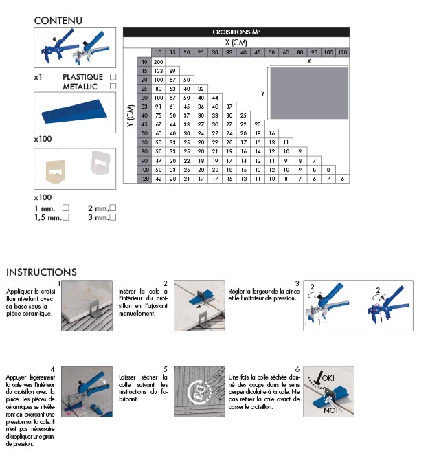 Ce kit de nivellement pour carrelage au sol est composé de 200 croisillons d'une épaisseur de 1mm, 200 calles, ainsi qu'une pince en métal. Les croisillons de carrelage permettent de créer facilement un espace entre les carreaux de carrelage. Ces modèles sont autonivelants et permettent d'obtenir une bonne profondeur sans avoir systématiquement recours à un niveau à bulle. La pince contribut à améliorer l'efficacité de la pose, un confort, ainsi qu'une haute précision. .