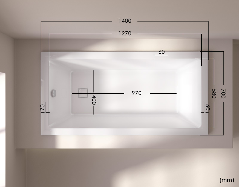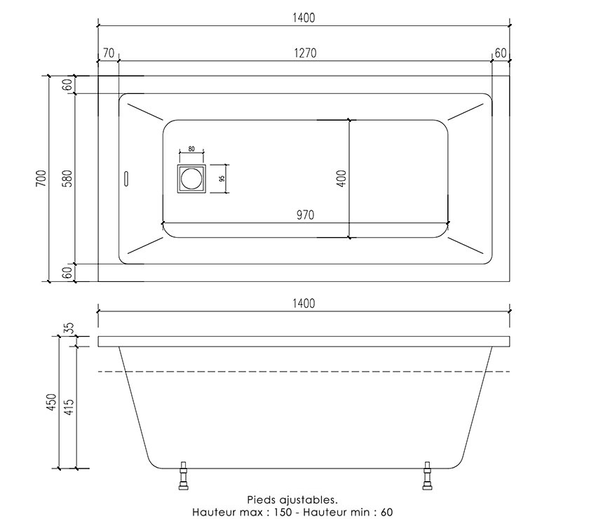 Baignoire encastrable Lavezzi 140x70 cm en acrylique blanc brillant avec pieds et vidage carré