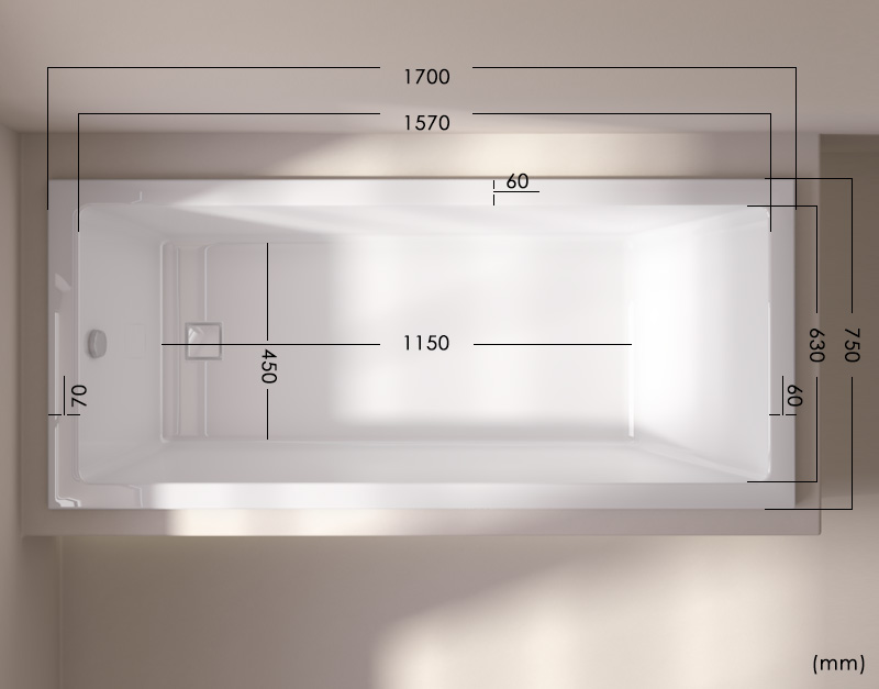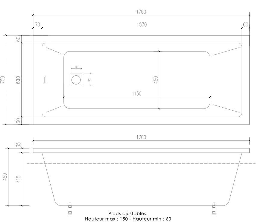 Baignoire encastrable Lavezzi 170x70 cm en acrylique blanc brillant avec pieds et vidage carré