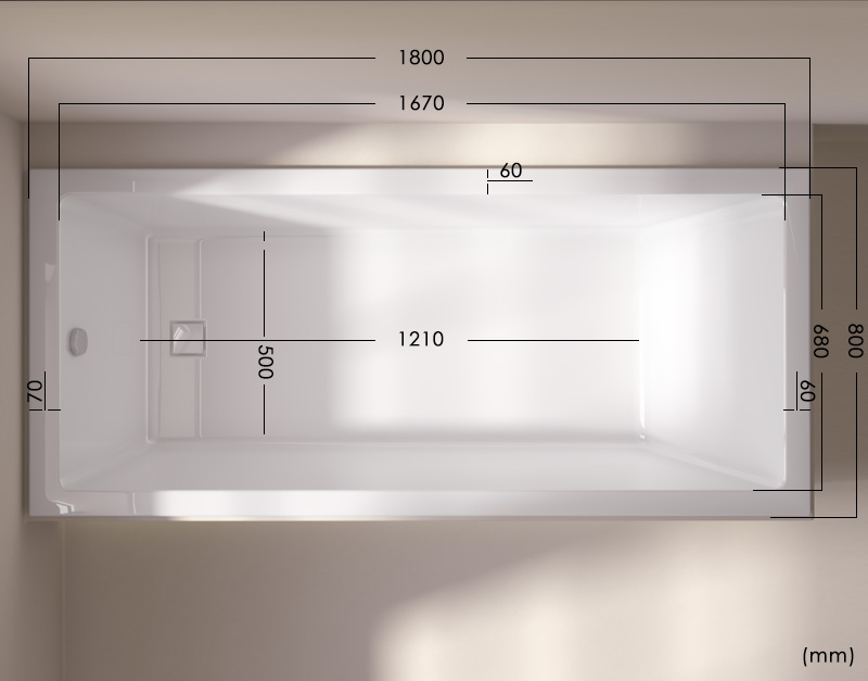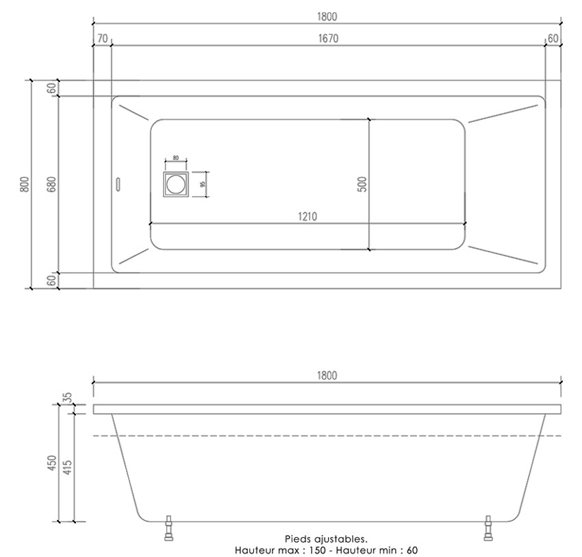 Baignoire encastrable Lavezzi 180x80 cm en acrylique blanc brillant avec pieds et vidage carré