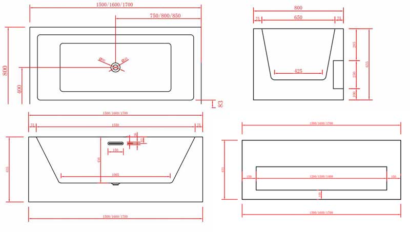 Longueur : 150 ou 170 cm. Largeur : 80 cm, Hauteur : 63,5 cm.