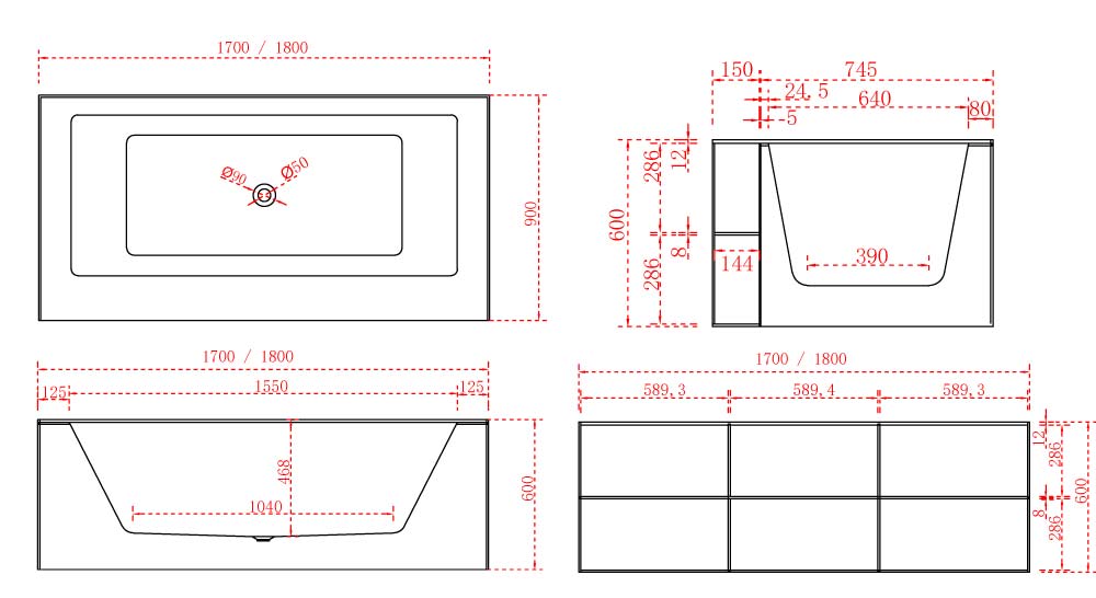 Longueur: 170 ou 180 cm. Largeur: 90 cm, Hauteur: 60 cm.