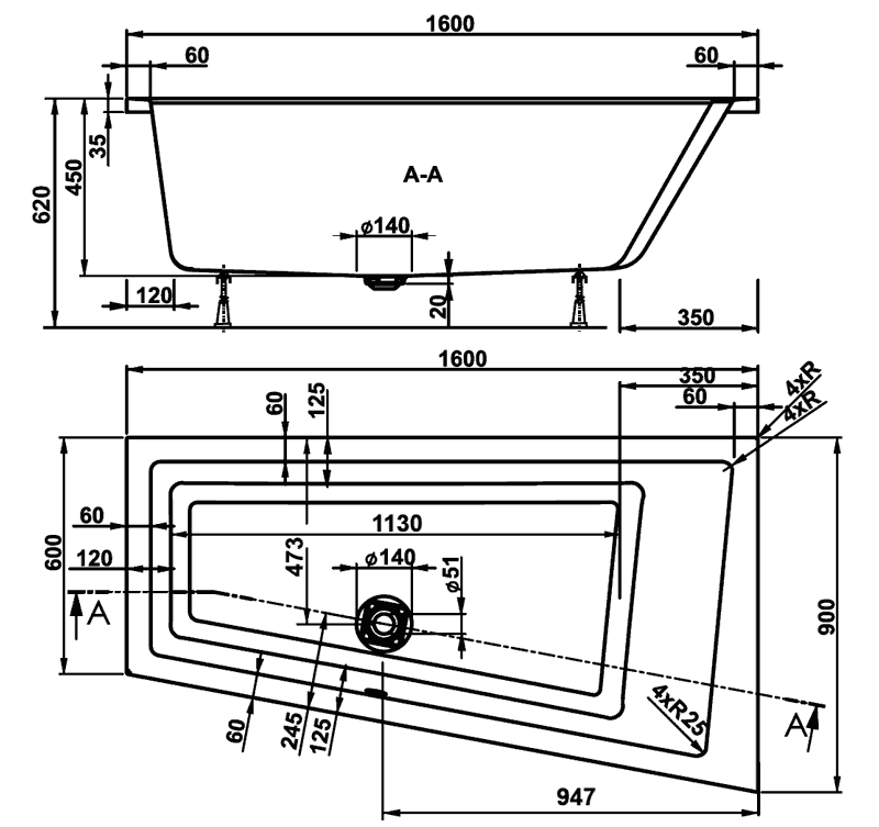 Baignoire asymétrique Cavallo, 160x90 cm, acrylique, version droite.