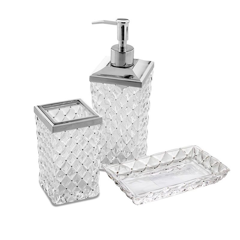 à poser en verre transparent capitonné décoré avec détails argentés.Pompe en métal chromé