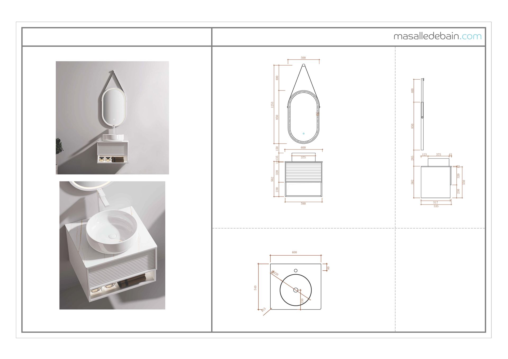 L’ensemble Minions est idéal pour les petits espaces, il allie minimalisme et élégance. Il se compose d’un meuble blanc mat avec rangement, d’un plan en pierre de synthèse effet marbre Carrara, d’une vasque ronde en céramique blanc brillant et d’un miroir ovale LED 50x35 cm avec cadre blanc mat et fonction anti-buée. Un concentré de style et de praticité.