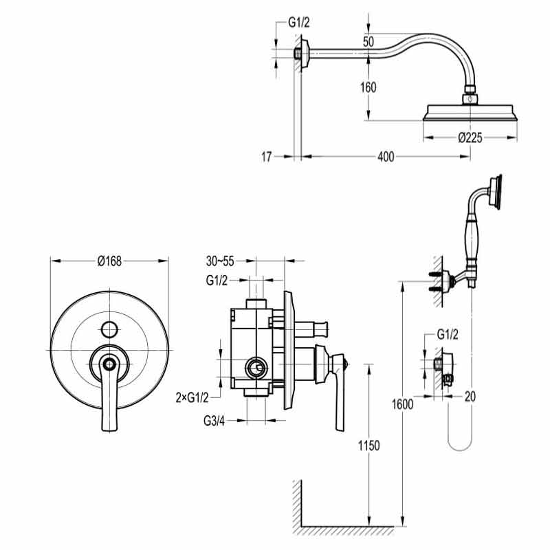 Cet ensemble avec robinet mural se compose de 2 entrées et 2 sorties, pour une installation à encastrer dans votre douche est fourni complet avec pomme de tête, bras mural, flexible, douchette et crochet.