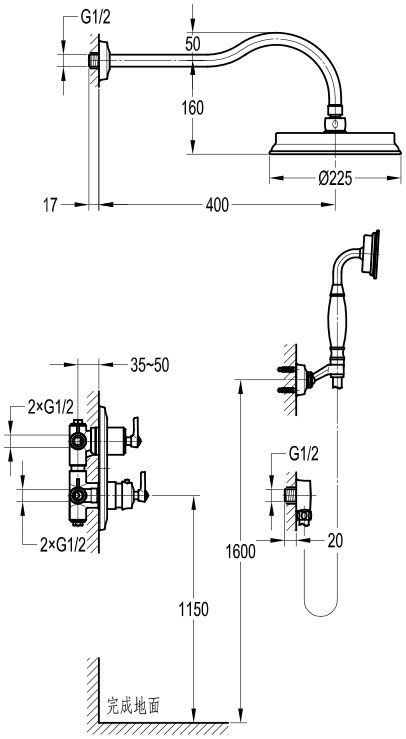 Composition douche Liberty en laiton et finition traitée cuivre, pour installation à encastrer. Thermostatique à encastrer, 2 entrées, 2 sorties. Corps d'encastrement inclus. Douche de tête diamètre 225mm. Douchette avec support, prise d'eau et flexible 150 cm.