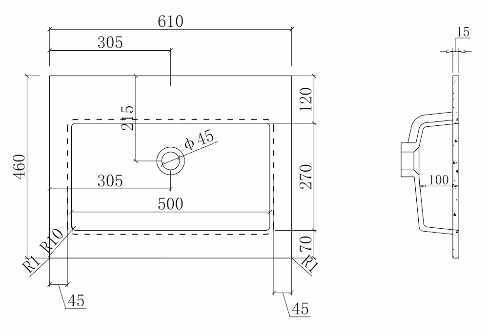 Meuble suspendu 60 cm, placage noyer naturel avec Plan vasque en résine, Louis