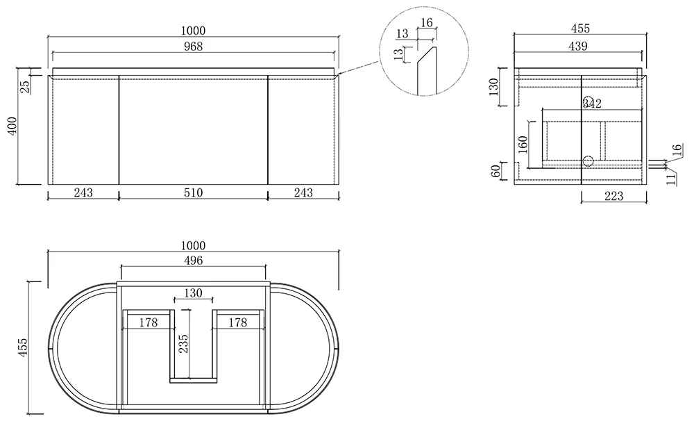 Meuble suspendu 100 cm, placage chêne naturel avec plan en résine minérale blanc mat, Céline