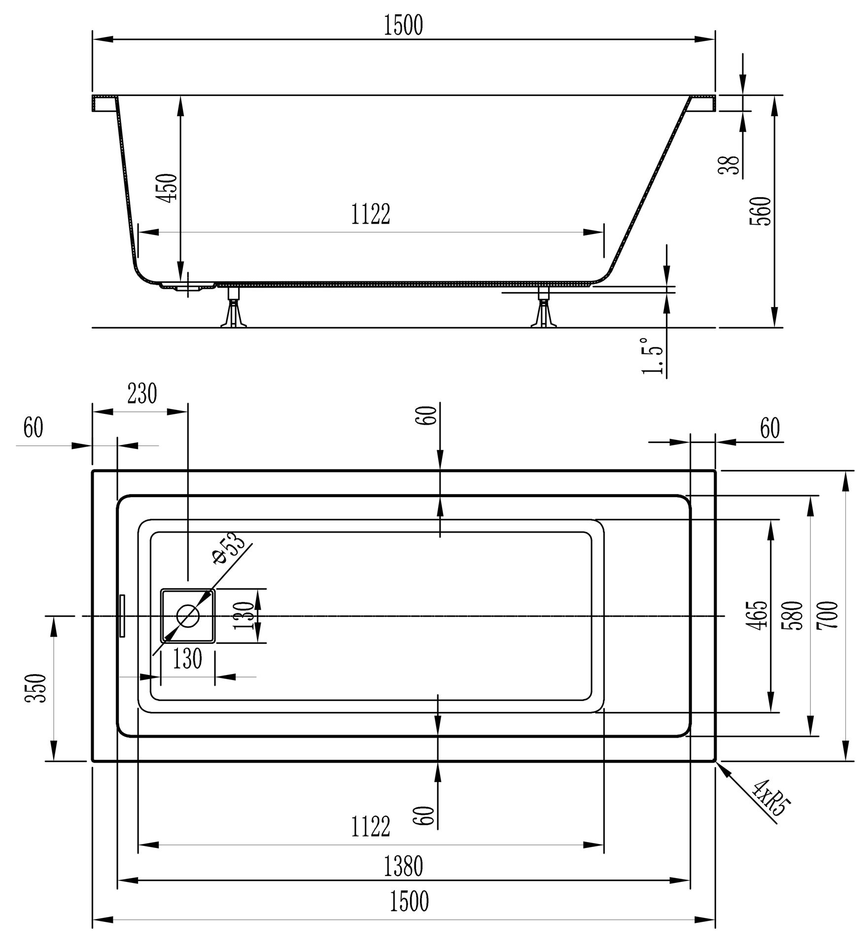 Baignoire en acrylique pour installation à encastrer. Avec trop plein. Facilité d'entretien.