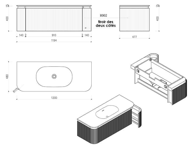 Le corps de ce meuble est réalisé en contreplaqué avec placage noyer cannelé et composé de trois tiroirs. Le plan vasque solid surface blanc n'est pas percé, vous laissant le libre choix du type de robinetterie. Deux tiroirs latéraux et un tiroir tiroir central permettent d'avoir un grand rangement de l'ensemble de vos produits.