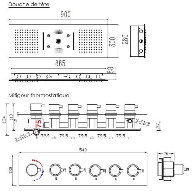 Cet ensemble de douche en laiton finition chromé comprend un ciel de pluie encastré 90x30 cm. Le panneau de contrôle avec son mitigeur thermostatique et ses 5 inverseurs simultanés permet de procurer 9 modes de douche pour un confort absolu (Pluie, Cascade, Brumisateur, Jet hydro central)