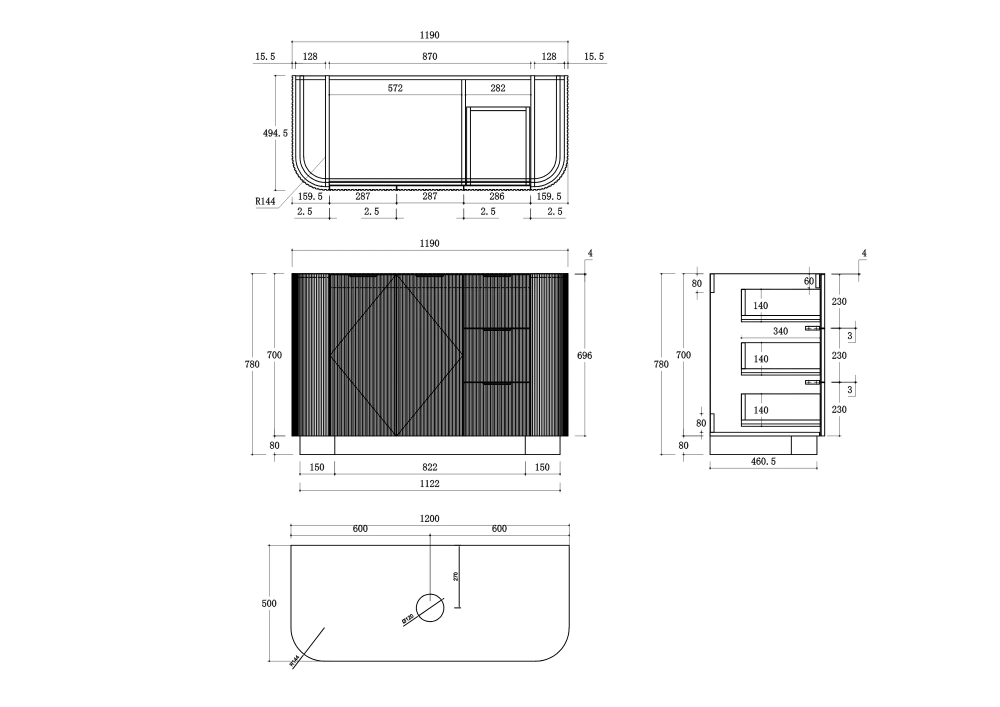 Ce meuble salle de bain est habillé d'une façade en bois nervuré finition chêne naturel, surmontée d'un plan en pierre de synthèse blanc mat. L'assemblage intègre des angles courbés et des poignées métalliques en finition laiton. D'une profondeur de 50 cm, ce meuble à poser repose sur une plinthe. L'espace de rangement est structuré par deux portes ouvrant sur un volume central et trois tiroirs superposés sur la section droite. Le plan dispose d'un percement de 120 mm dédié au passage de l'évacuation pour une vasque à poser.