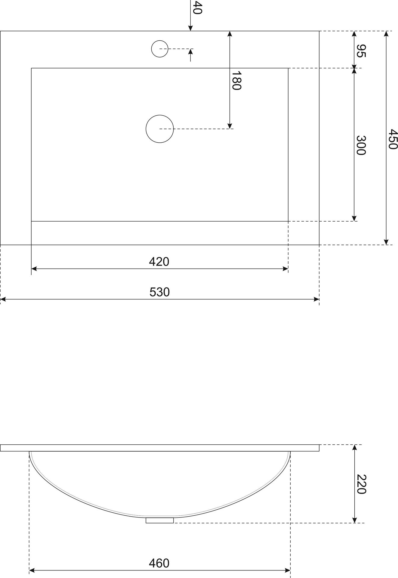 Avec plage de robinetterie et percement monotrou. Dimensions : L53 x l45 x H22 cm. Epaisseur : 1,6cm