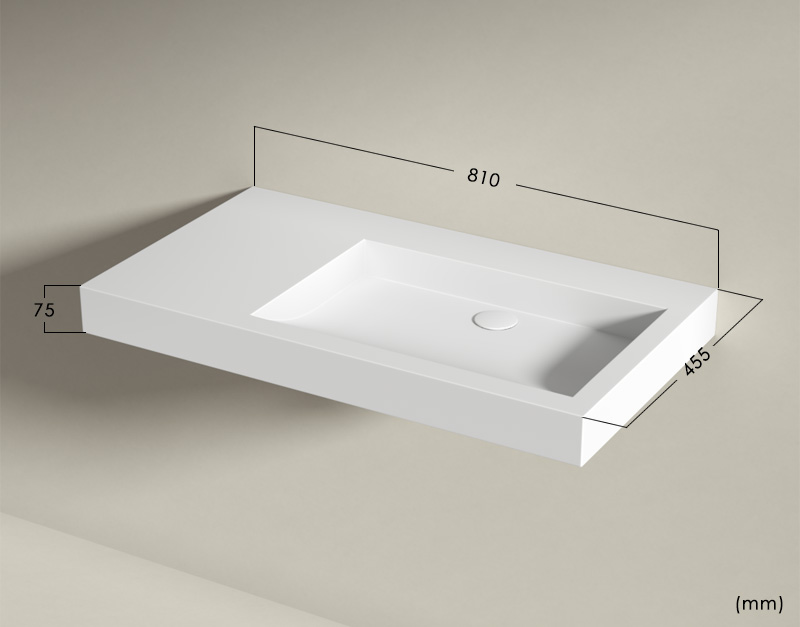 Sa large plage sur le côté permet de poser vos accessoires. Lavabo avec plage de robinetterie. Sans percement (la résine se perce facilement à l'aide d'une scie cloche). Sans trop plein, il faudra l'associer avec une bonde à clapet fixe en option. Dimensions : 81 x 45,5 x 7,5 cm