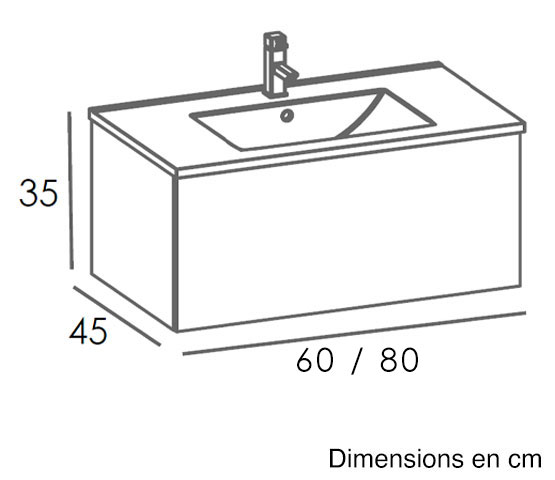 Ce meuble Caruso 60 ou 80 cm noir mat avec plan vasque en céramique antibactérienne est équipé d'un tiroir habilement découpé pour laisser le passage au siphon. Il est totalement intégré dans la façade et équipé de glissières à fermeture amortie "soft-close". La cuve dispose d'un trop-plein avec cache de finition chromé. Robinetterie, bonde et siphon à commander séparément.