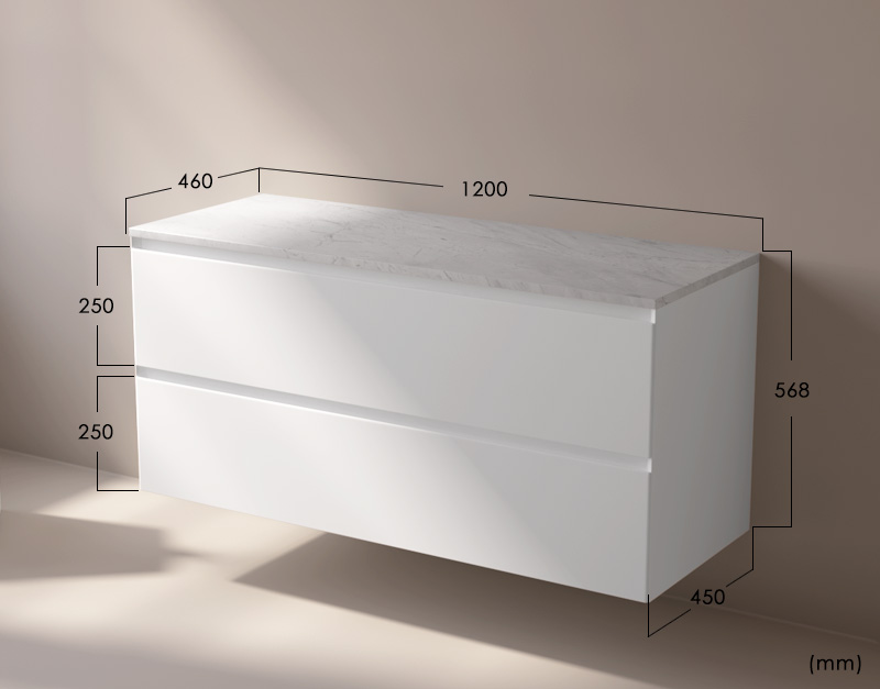 Meuble suspendu 120cm, 2 tiroirs, blanc mat, et plan marbre véritable, One