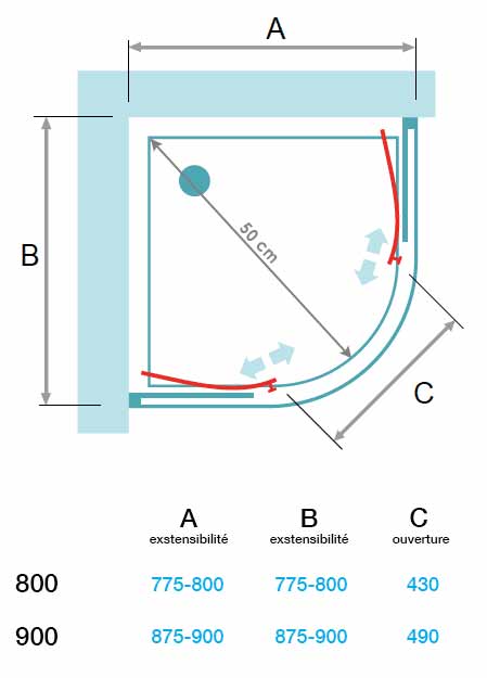 Cabine de douche quart de rond pour installation en angle. 2 parois coulissantes sur 2 parois fixes en verre securit 6 mm d'épaisseur. Profilé en finition chromée extensible jusqu'à 2,5 cm. Hauteur : 195 cm. Rayon : 50 cm