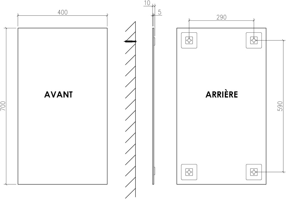 Miroir épuré, fourni avec ses fixations. Dimensions 40x70cm. Epaisseur du verre 5mm.