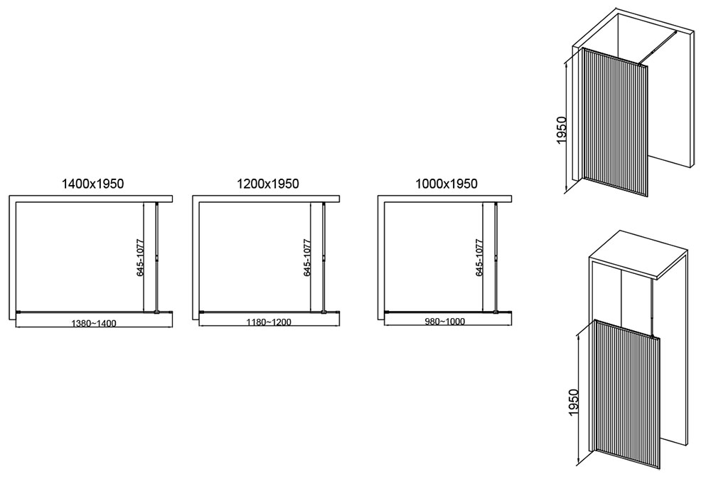 Paroi de douche fixe 100,120 ou 140 cm, verre cannelé avec profilé noir mat, Walk In