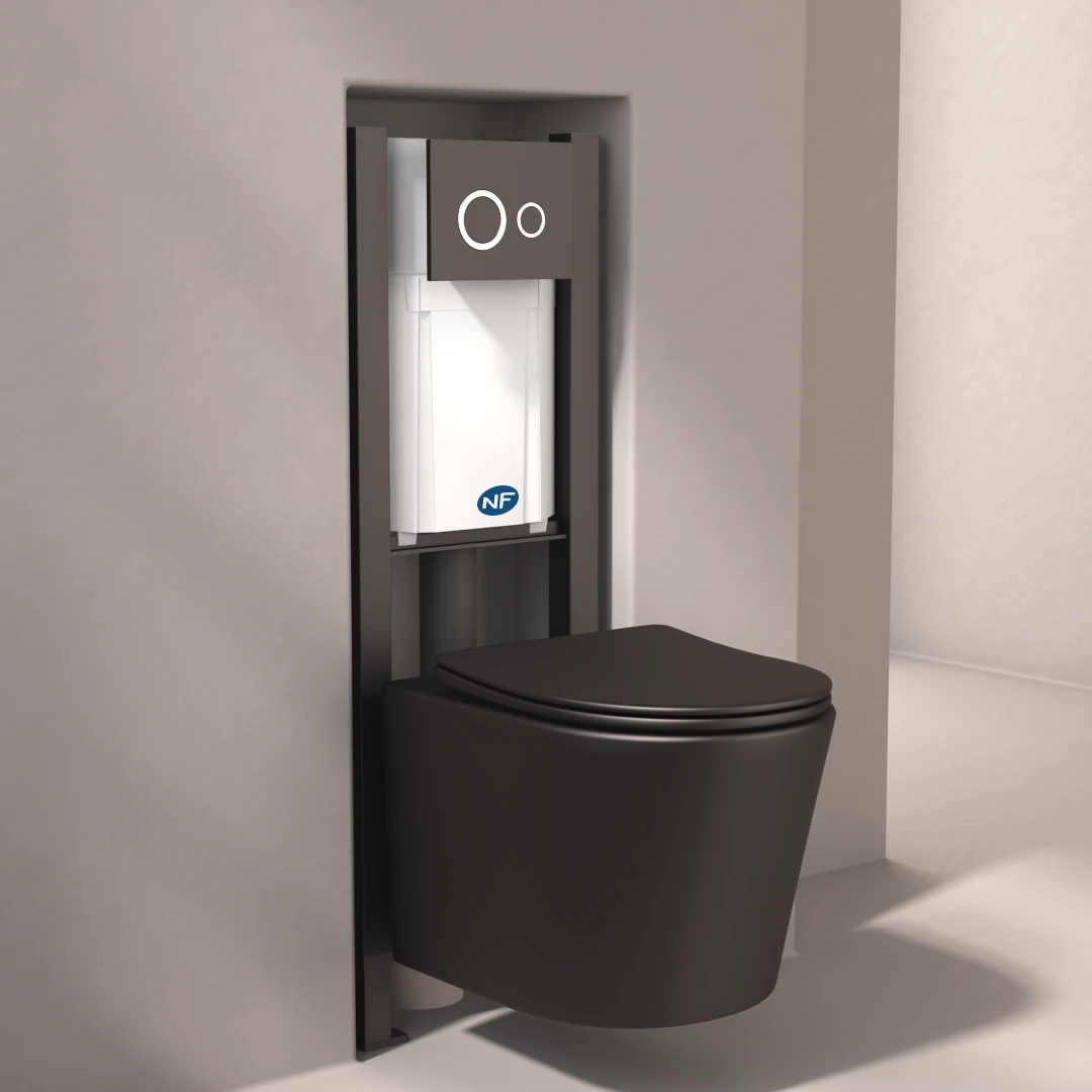Bâti compact WIRQUIN + Plaque de déclenchement noire + WC suspendu Noir Rimless Flavia - Pack WC suspendu.