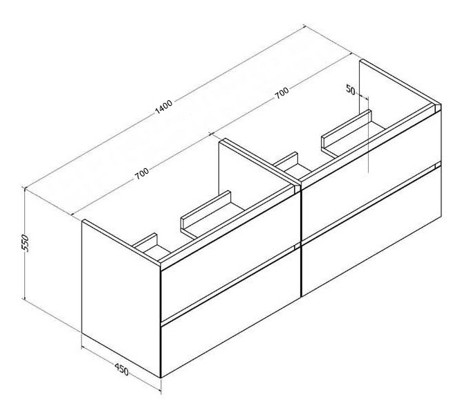 Ce meuble salle de bain suspendu One 140 cm pour vasques à poser est équipé de 4 tiroirs fermetures amorties "soft-close". Les deux tiroirs du haut sont habilement découpés pour laisser le passage aux siphons, les deux tiroirs du bas sont pleins.