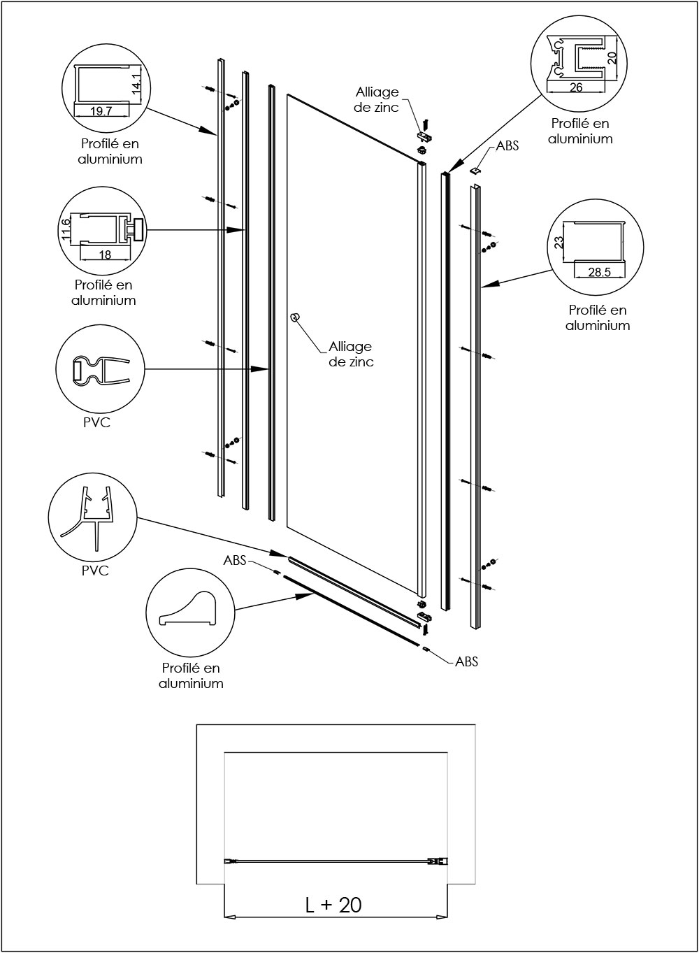 La porte de douche battante est fabriquée en Verre Securit 6 mm traité anticalcaire. Profilés en aluminium finition chromé.