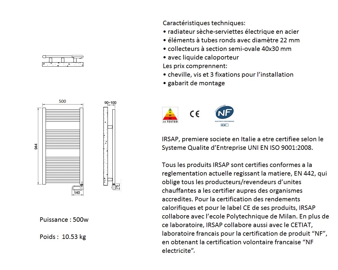 Il est idéal comme mode de chauffage salle de bain, avec sa structure en acier et ses finitions 3 coloris au choix : Blanc ou Gris titane métallisé. Ce seche serviette dispose d'un boitier électrique CE et NF 2 étoiles, Classe 2. Régulation de la température par boitier de contrôle digital et liquide caloporteur. 94.4 X50 500W