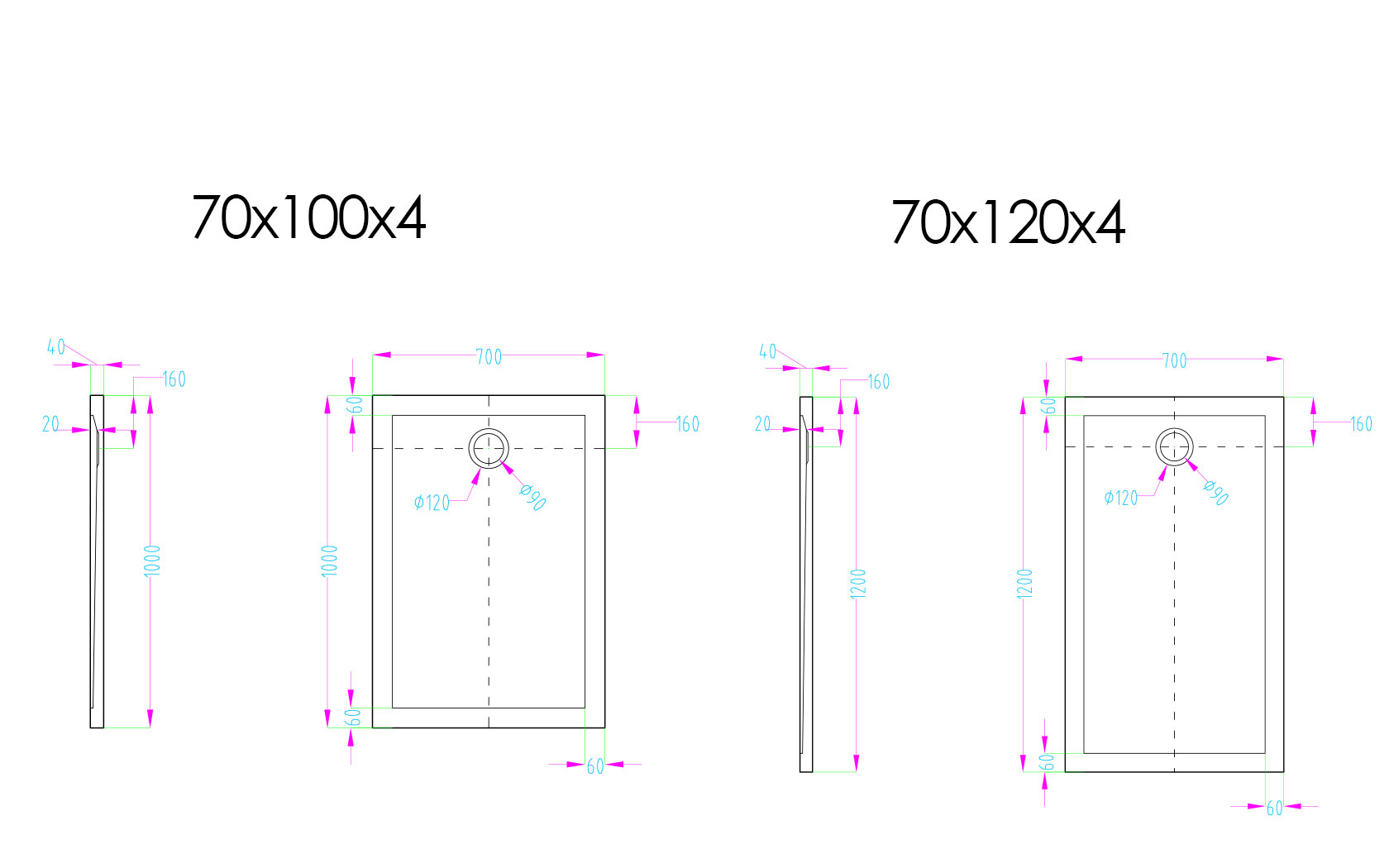 Receveur de douche 70x100 ou 120 cm, acrylique, Oz.