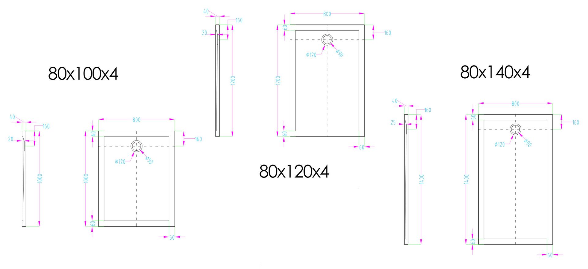 Receveur de douche 80x100,120 ou 140cm, acrylique, Oz.