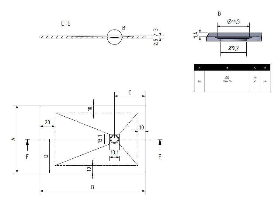 Receveur de douche, 80x90 à 200 cm, grille + bonde inclus, Nuance