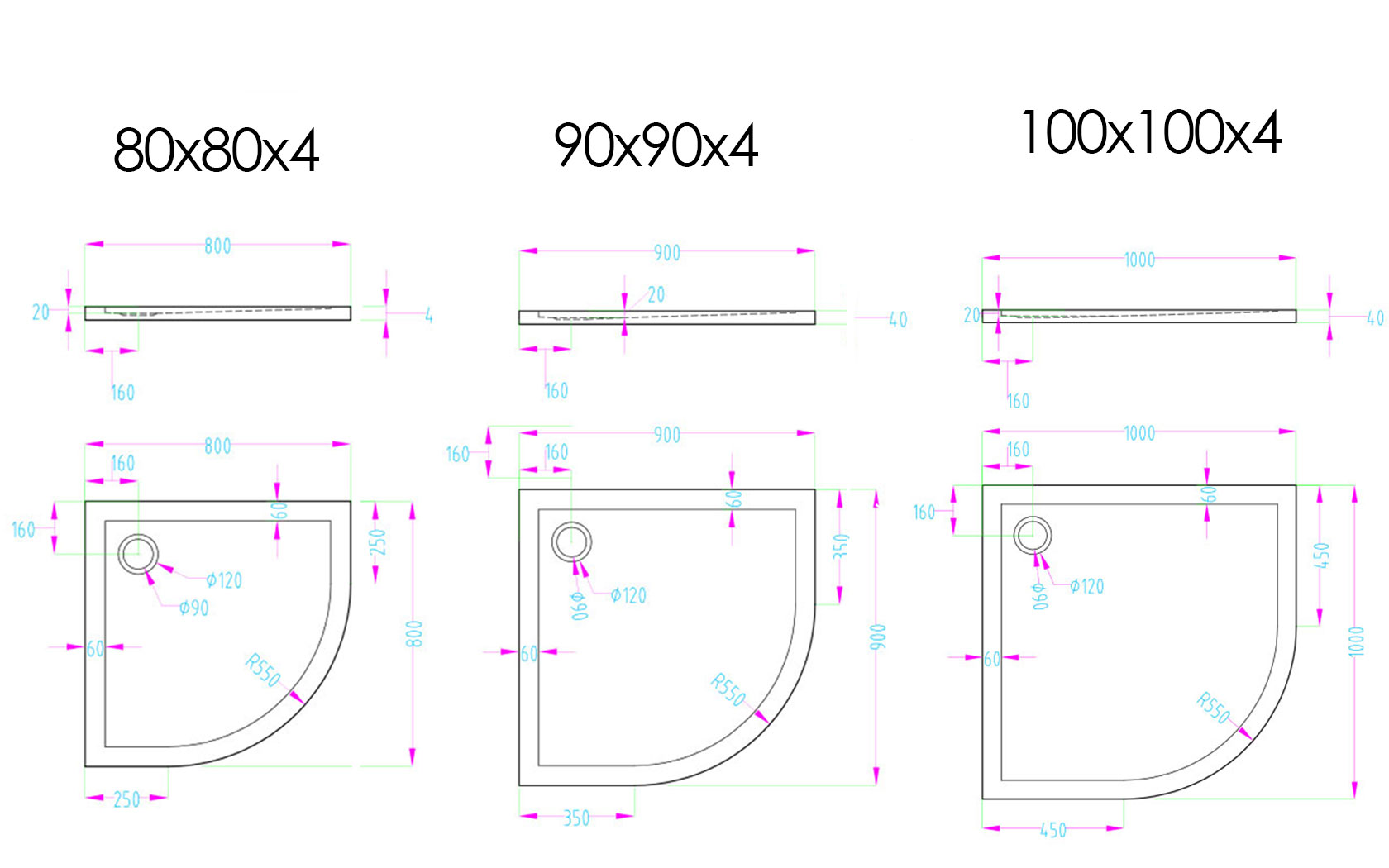 Receveur de douche rond 80x80, 90x90 ou 100x100 cm, acrylique, Oz.